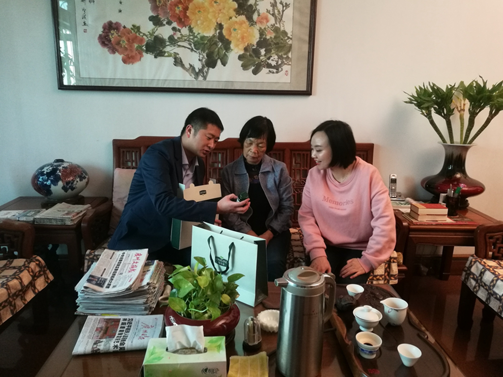 隨后,富諾健康總經理助理程前鵬、海珠區民政科科長徐艷、海珠區江南大道南社區居委會主任麥巧云上門一起走訪了海珠區昌崗街道小區的困難家庭和老黨員們。富諾健康總經理助理程前鵬更是與老人們拉起家常,詳細詢問了老人們的生活和身體情況,并囑咐他們要保重身體。